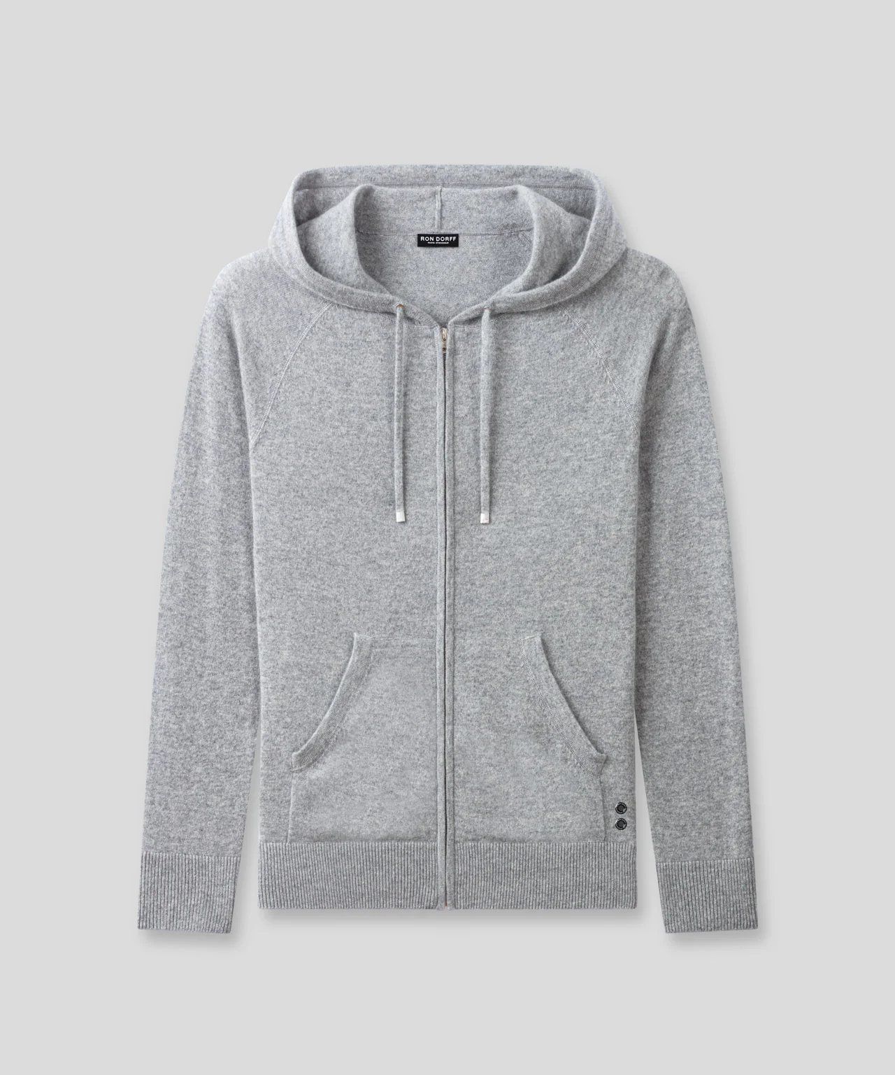 The classic zipped pullover hoodie with front pockets upgraded in a luxurious, 100% ultra-soft, breathable, Pure Sports Cashmere. Designed with a slightly tapered fit. Drawstrings with RD engraved metal tips for perfect adjustment. Swiss-made, anti-tear zip with RON DORFF engraved puller. Finished with ribbed cuffs and waistband. Featuring the two discrete black-lacquered RD eyelets on the side.