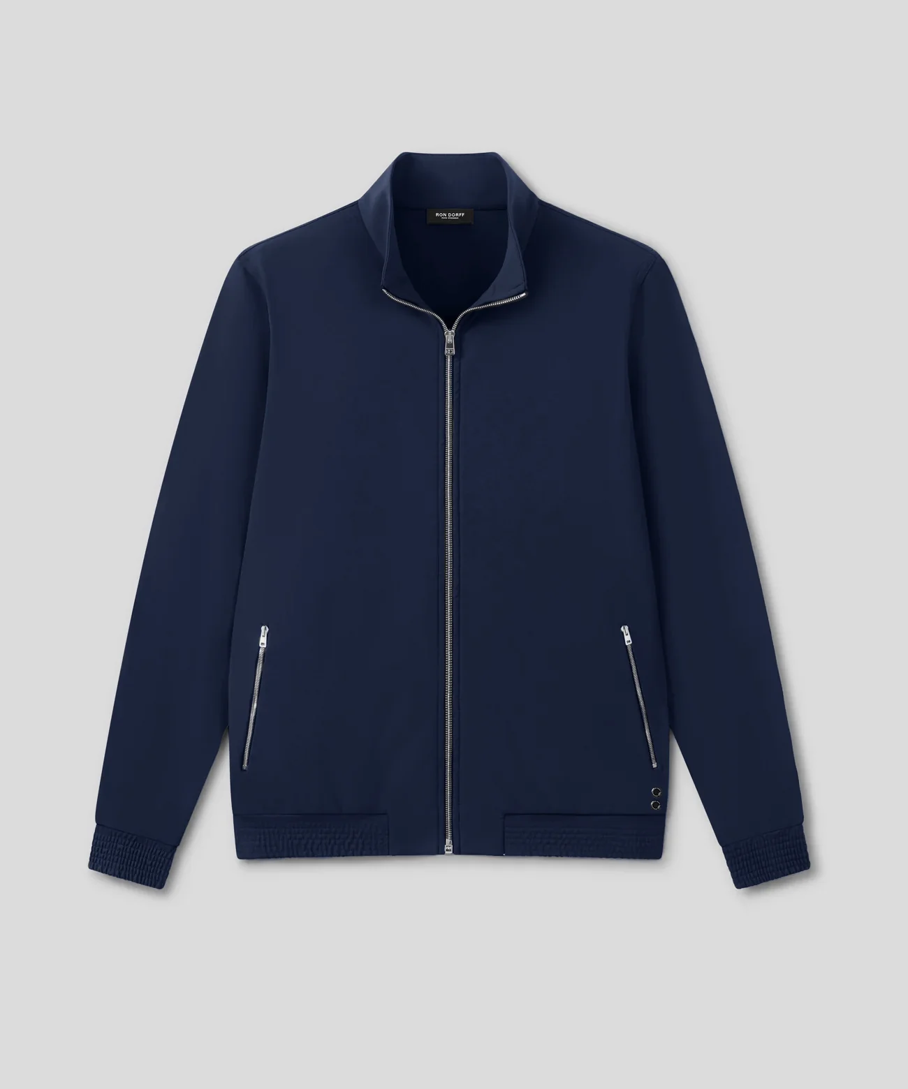 The classic zipped tennis jacket revisited for chic city wear and ideal for mid-season days. Upgraded in an ultra-resistant, interlock piqué made in a high-tech mix of light nylon and spandex. Designed with a slightly tapered fit, zipped side pockets and finished with ribbed cuffs, waistband and collar. Swiss-made anti-tear zip with RON DORFF engraved puller. Featuring the double black-lacquered RD signature eyelets.