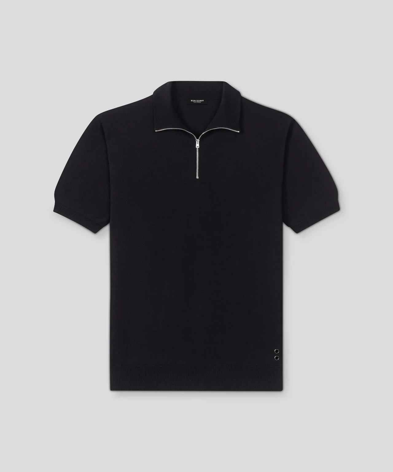The tennis polo upgraded in a premium cotton-silk mix. The traditional buttons have been replaced by a functional and sporty zip that allows wearing the polo wide open, slightly closed or fully-zipped up as a turtle neck. Designed with a slightly tapered fit and finished with ribbed cuffs, waistband and collar. Swiss-made anti-tear zip with RON DORFF engraved puller. Featuring the two discrete black-lacquered RD eyelets on the side.