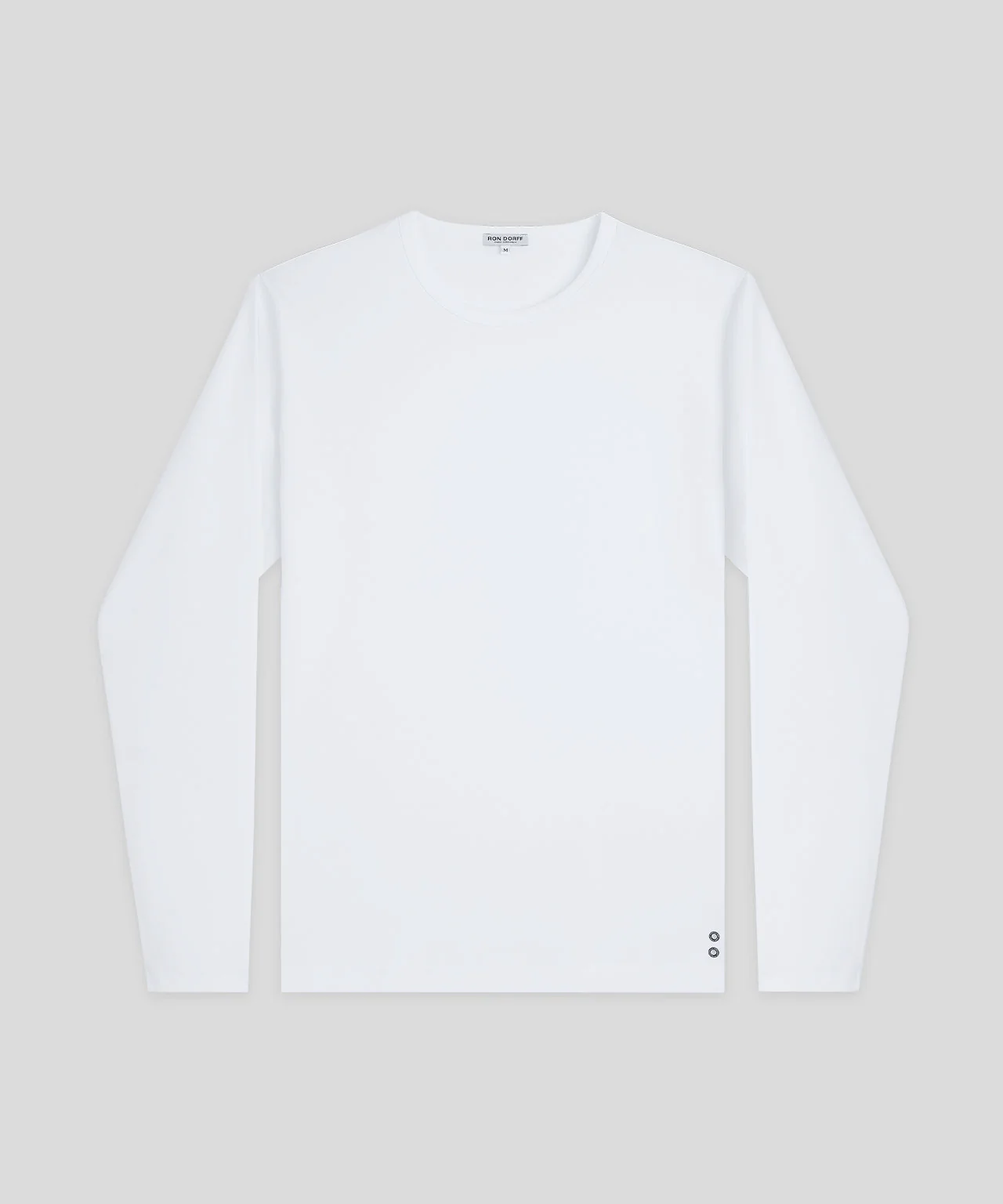 The classic long-sleeve RON DORFF t-shirt revisited in an ultra-soft cotton. Designed with a slightly tapered fit. Crew neck with elegant binding collar for chic urban wear. Featuring the two discrete black-lacquered RD eyelets on the side.