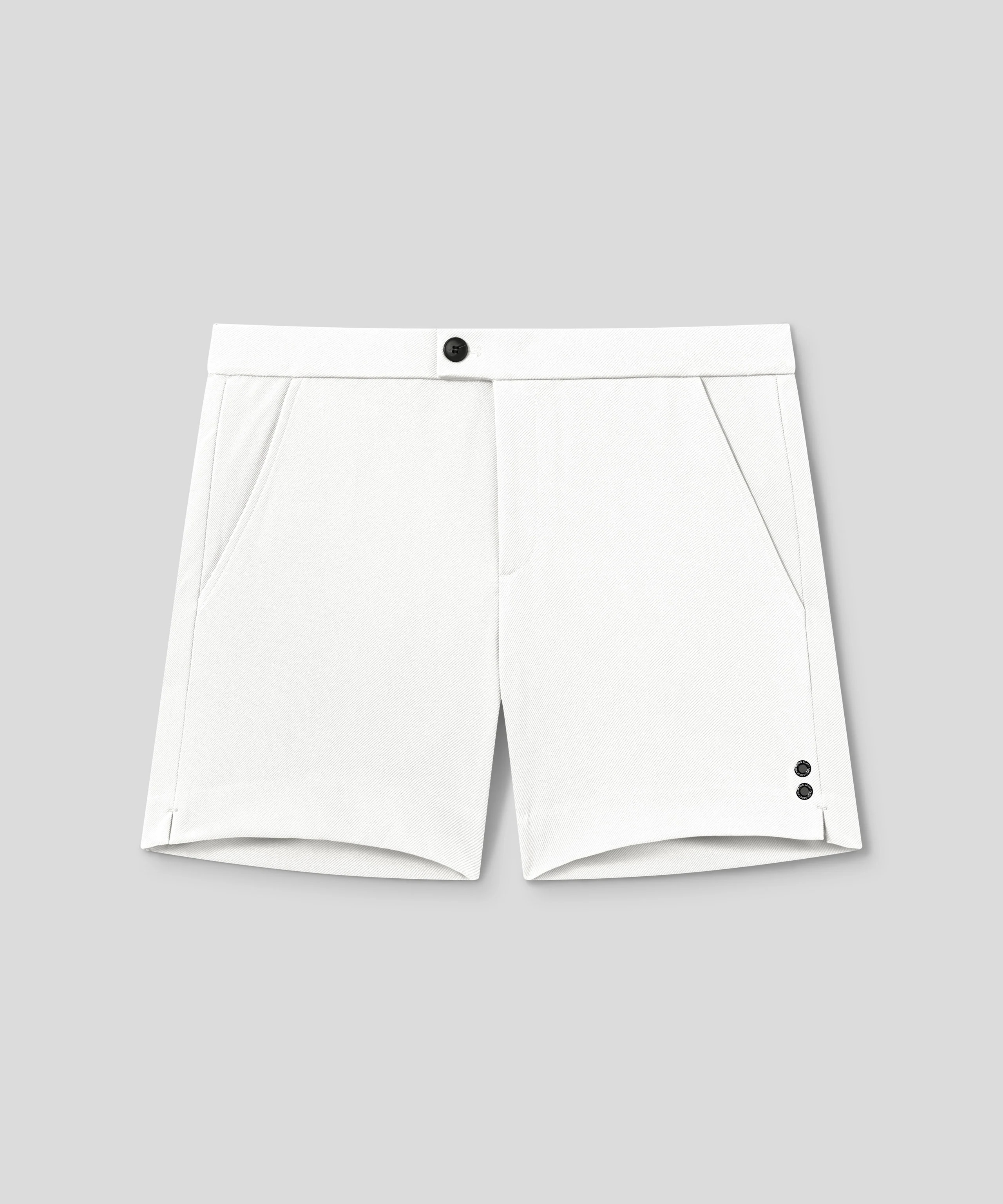 The cult tennis shorts of the early 80s as worn by Björn Borg, Jimmy Connors and John McEnroe. Designed with a slightly tapered fit with side slits. Cut in a breathable, stretch polyester with a hint of elastane. RON DORFF engraved button and two side pockets. No back pockets. Featuring the two discrete black-lacquered RON DORFF eyelets on the side.